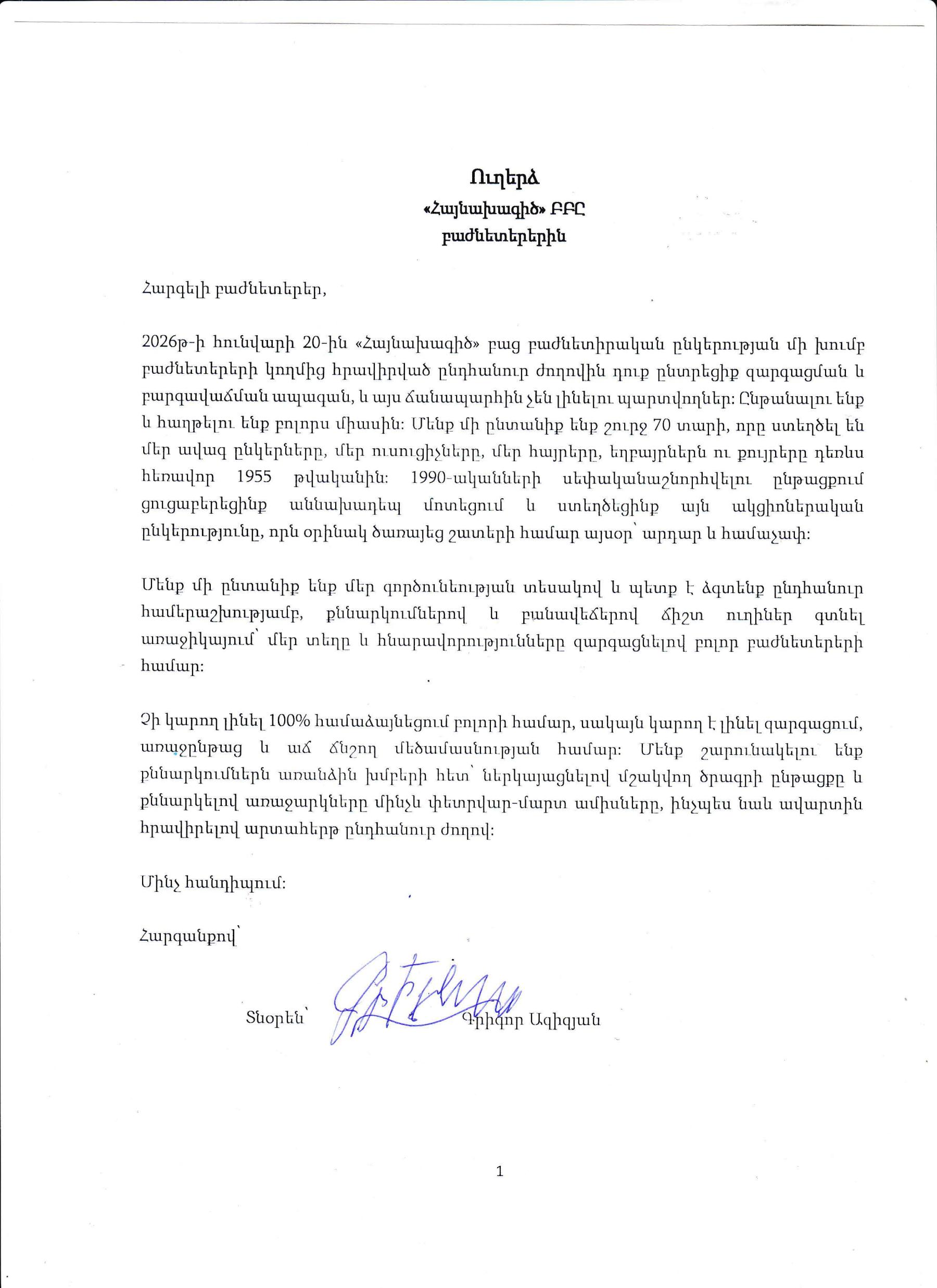 «ՀԱՅՆԱԽԱԳԻԾ» ԲԲԸ 20,01,2026թ․ արտահերթ ժողովի արձանագրություն ►